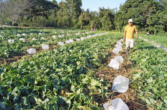 美里のへちま畑では、へちま化粧水用のへちま水の採取が行われました。