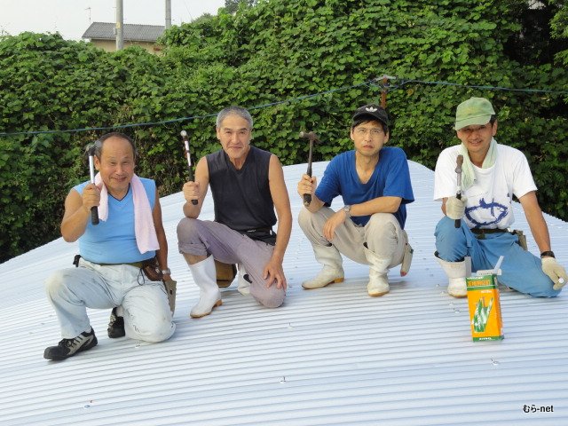 暑さの中、屋根の上でのトタン打ち、豚さんと共に暮す人ならではですねえ。