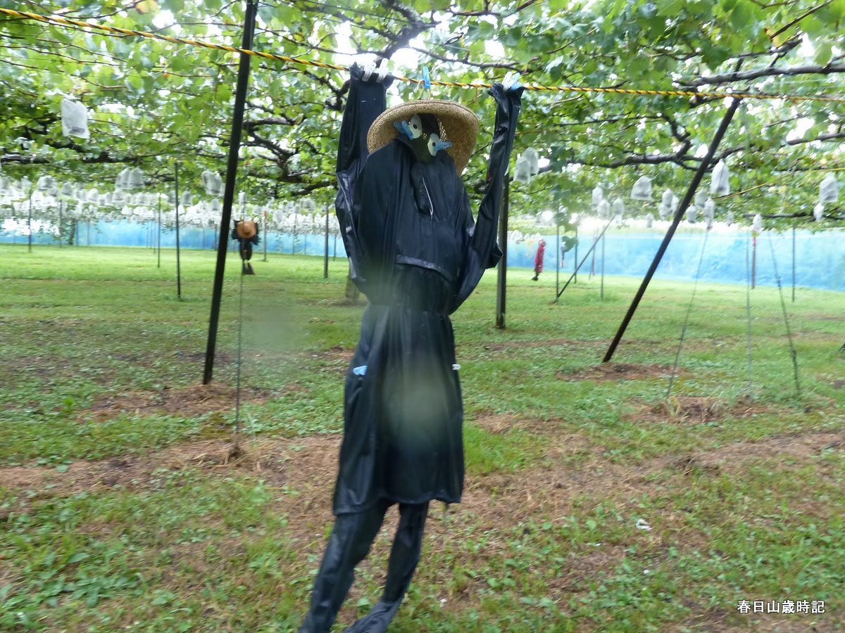 春日山実顕地・青連寺農場の紅伊豆(ベニイズ)ブドウ棚の下に動く案山子が15体ほど常に動きまわっています。行ったり来たり、、、。