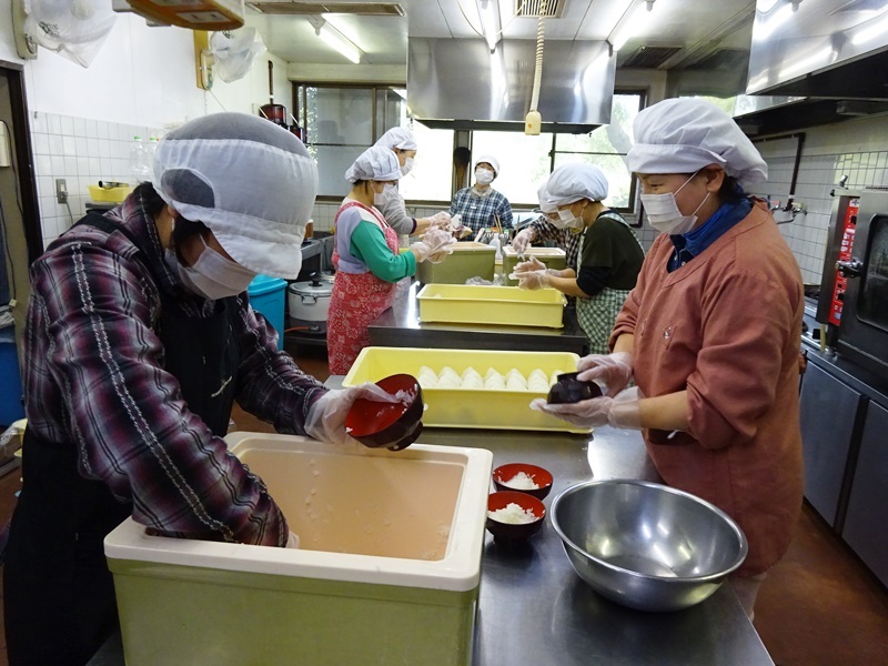 17日は朝から、男性は会場づくり、女性は野外食のおにぎり作りやデザート作り、宿泊施設の掃除やシーツの洗濯など。