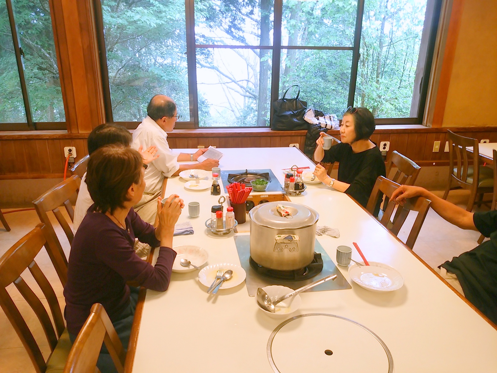翌朝、8時半、大勢の(年配の)方が一階の食堂に集まっている。まずは連絡事項、それから最近の動向、各係の近々の予定など報告や話しあい。最後に体操。