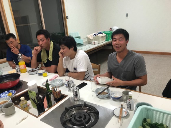 青空の元、稲刈り作業は楽しいのですが、それにも増して一日の作業を終えてロビーに集まり、泡の出るのを飲みながら懇談するのも楽しみの一つです。今では稲刈りに欠かせない?生活のひとコマとして定着しているように見えます。