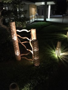 陽が落ち始めた前庭にそぞろ人が出てきて、思い思いに竹灯りを楽しんでいました。