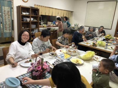 コロナ禍の中、人の出入りも少なく、静かな暮らしをしていた榛名の皆にとって久々のとんでもなく嬉しい出来事で、会食の準備を進める中で村の空気も活気づいていました。皆が一同に会してお祝いするにはどうしたらいいかと、みんなで知恵を寄せ合って、テーブルの配置などを考えました。他は事細かく決めなくてもそれぞれのできることで準備を進めました.。海衣ちゃんも準備に加わって、明るい笑い声が厨房に響いていました。