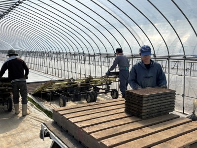 ハウスに約8000枚以上の種子籾が埋め込まれたトレーを敷き詰めます。