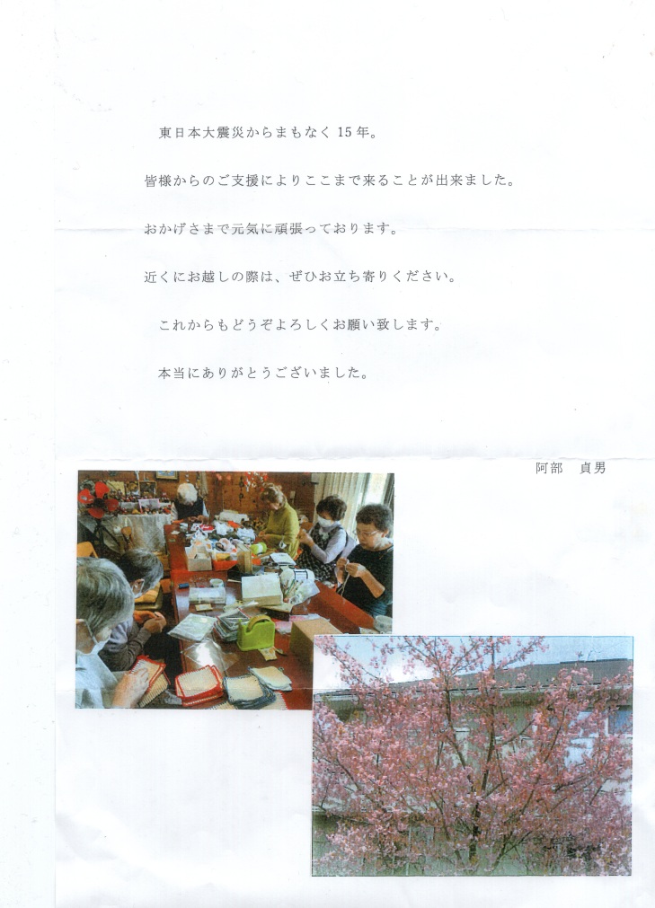 早くも15年なのか、まだ15年なのか、それでもあの東日本大震災の日がやってきます。それに先がけて石巻の阿部貞男さん、和子さん夫妻からメッセージが届きました。